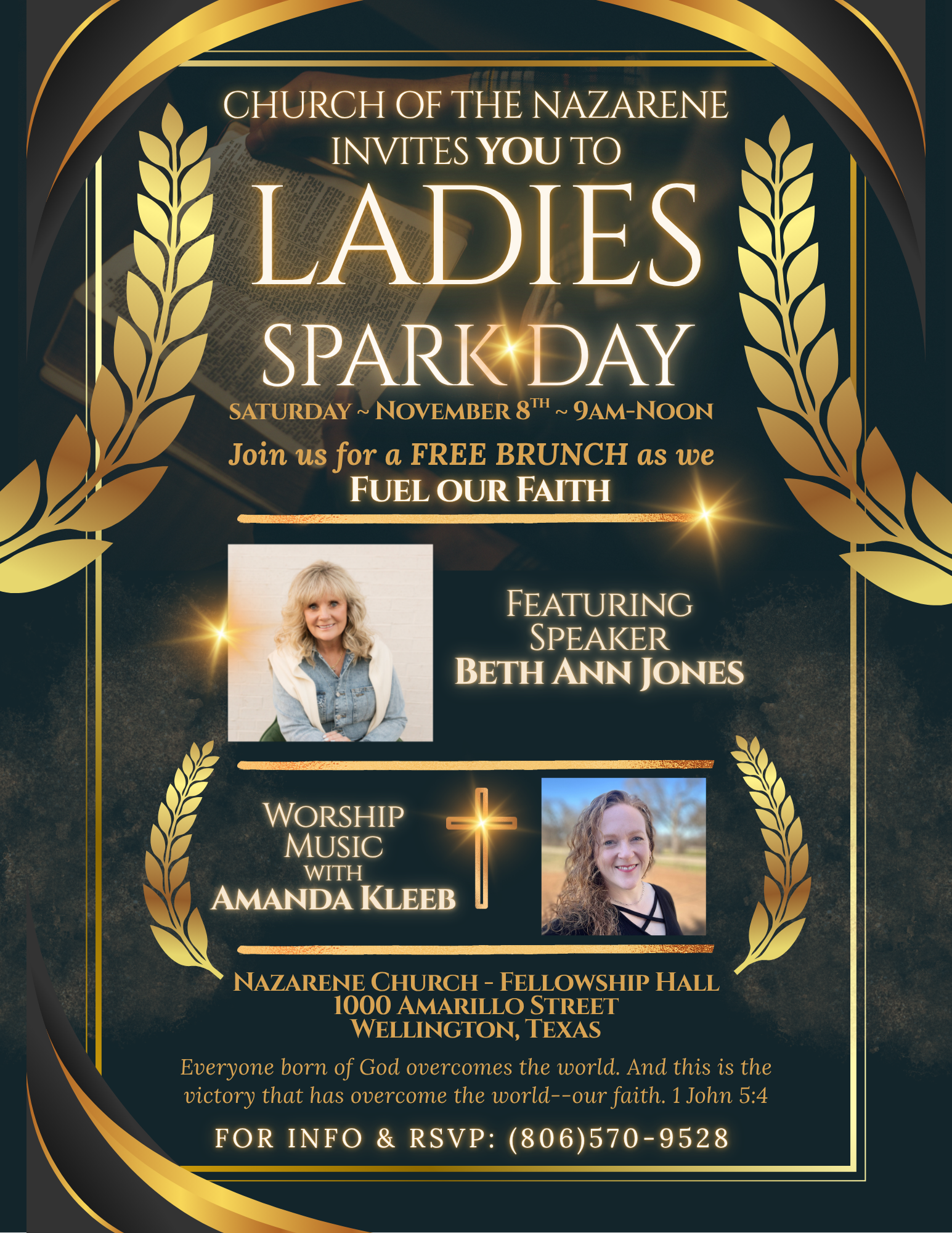 Our second annual Ladies Spark Day was a wonderful time in the Lord!! The theme was Igniting Joy! Our featured guests included speaker and author Candy Gibbs and worship leader Kala Simpson . Free brunch was served. Candy Gibbs is the Executive Director of Hope Choice Pregnancy Centers and Mentoring Programs in Amarillo, Texas. With a degree in psychology, Candy has served as the national co-chair for the Campaign for Life in America . A powerful and dynamic speaker, Candy delivered bold truth amidst a tip-toeing culture. A big thank you to everyone behind the scenes who helped to make this a blessed event! See photos below of our time together! Watch for a “save the date” for next year’s spark day!! You don’t want to miss it!!